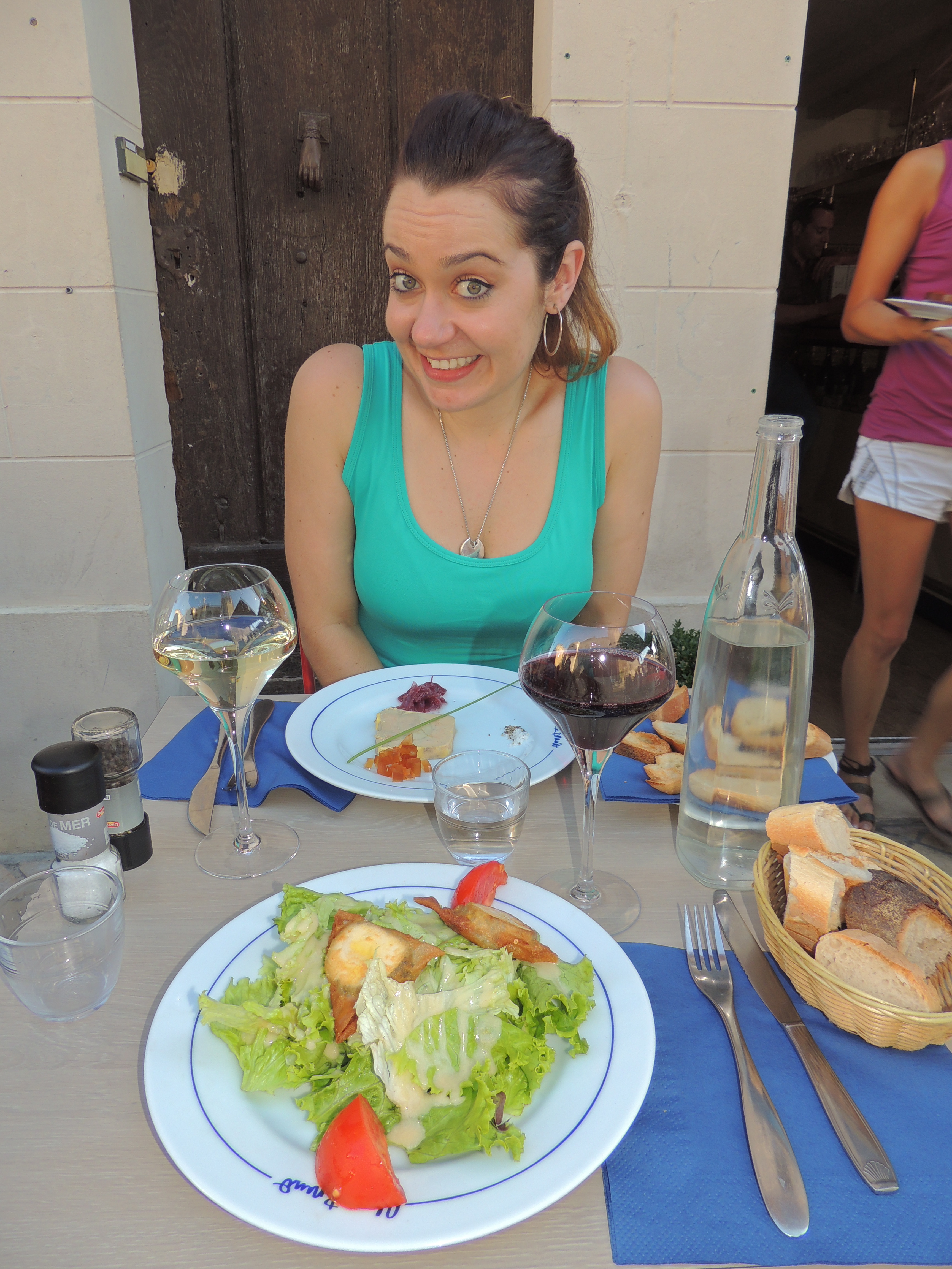 We started with a shared platter of foie gras and fresh bread (€12) and a chèvre (goats cheese) salad for €7, complemented perfectly by a couple of glasses of the local Gourmandaise wine at €6 each. As you can see, the chilled wine went down a treat!